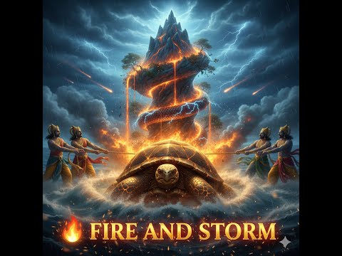 My video covers the dramatic peak of the churning: the mountain blazing with fire and smoke from the naga Vasuki's breath, cooled by a massive, balancing rainstorm